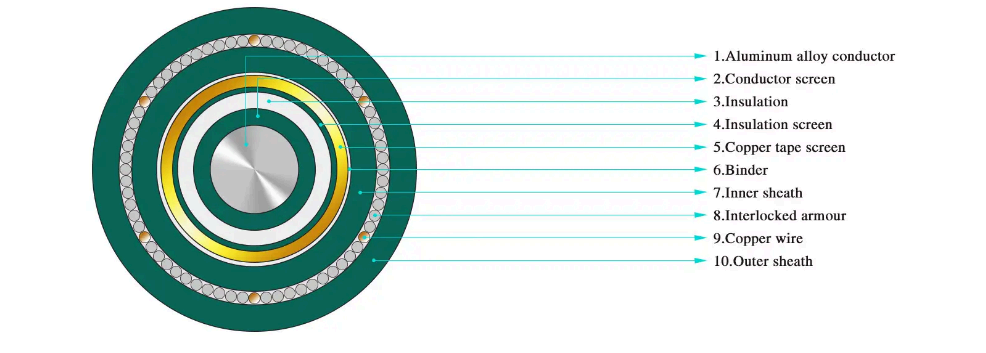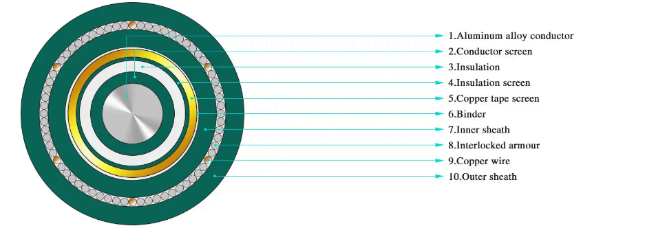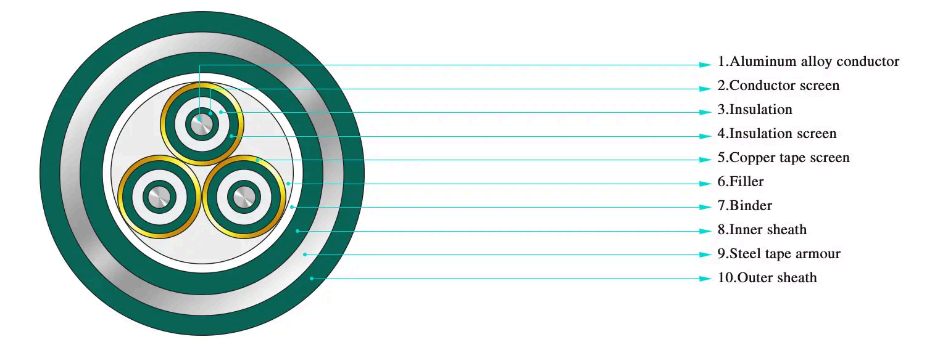 ·Třížilový XLPE izolační ocelový páskový pancéřový napájecí kabel pro jmenovité napětí od 3,6/6kV~26/35kV