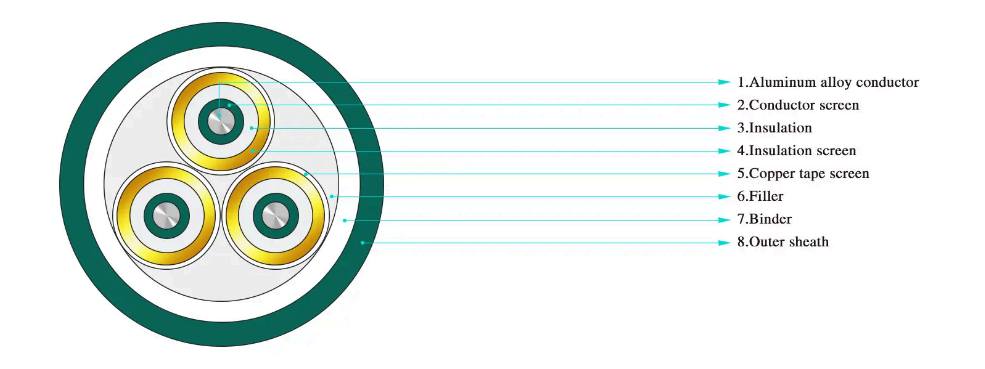 ·Třížilový XLPE izolační napájecí kabel pro jmenovité napětí od 3,6/6kV~26/35kV